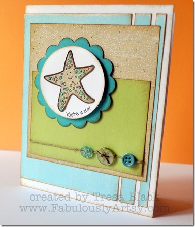 The final project was pretty much CASE’d from another off-the-charts talented CTMH consultant, Tresa Black.  I so loved how she cut the cardstock into strips and the overall look of her card.  However, I chose to use the fish image from the “Under the Sea” stamp set, rather than the starfish.