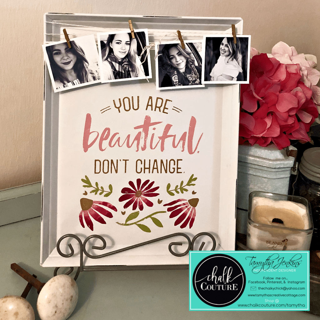 I love, love, love how this came out. I used the exclusive October Club Couture transfer on the Chalk Couture metal tray in Currant Jam, Mauvelous, Shimmer Olive and Shimmer Gold Chalkology Pastes. I then just wrapped some pink twine from Stampin’ Up! and attached some black and white photos of my daughter with some mini clothes pins I had in my stash.